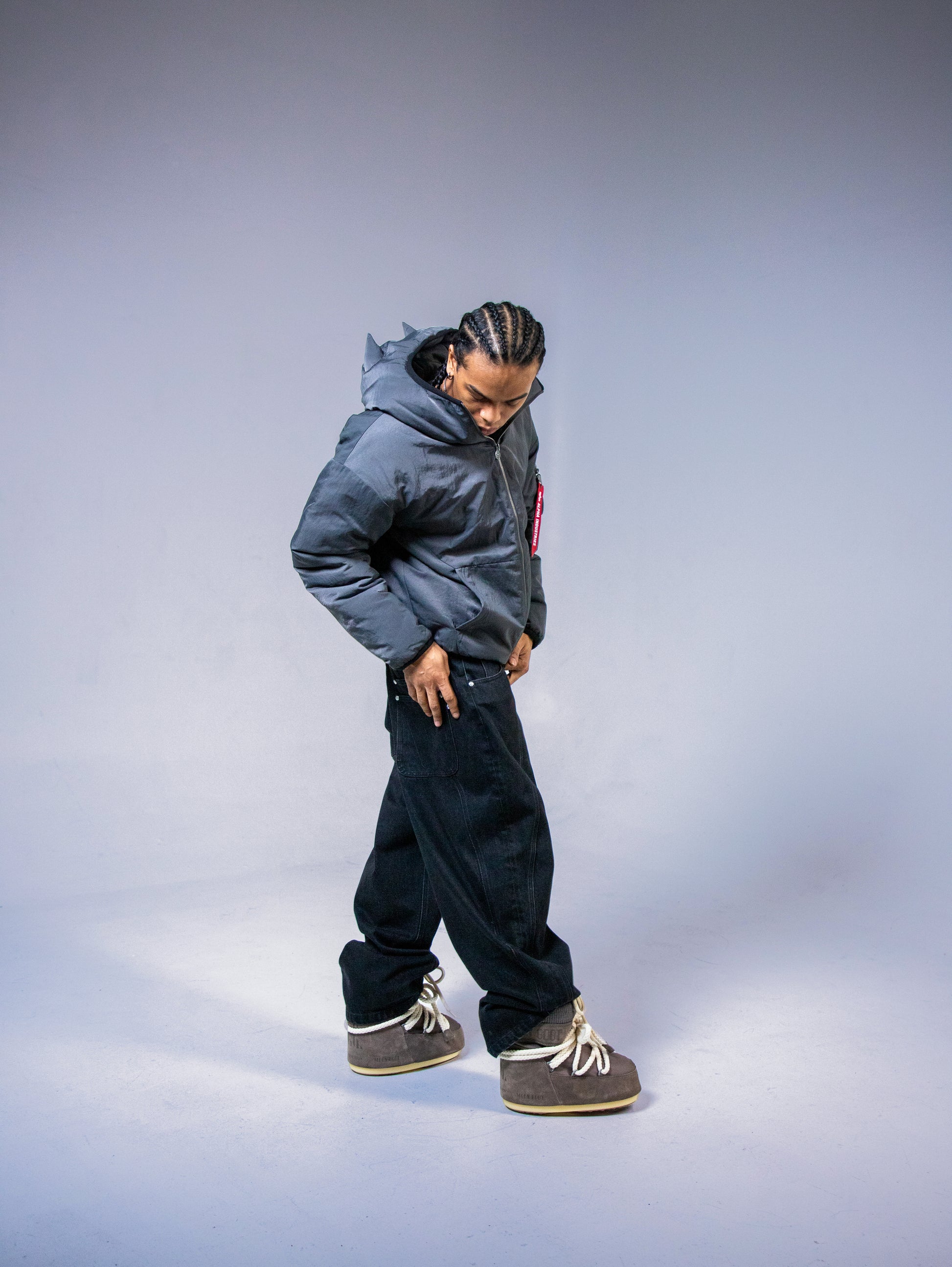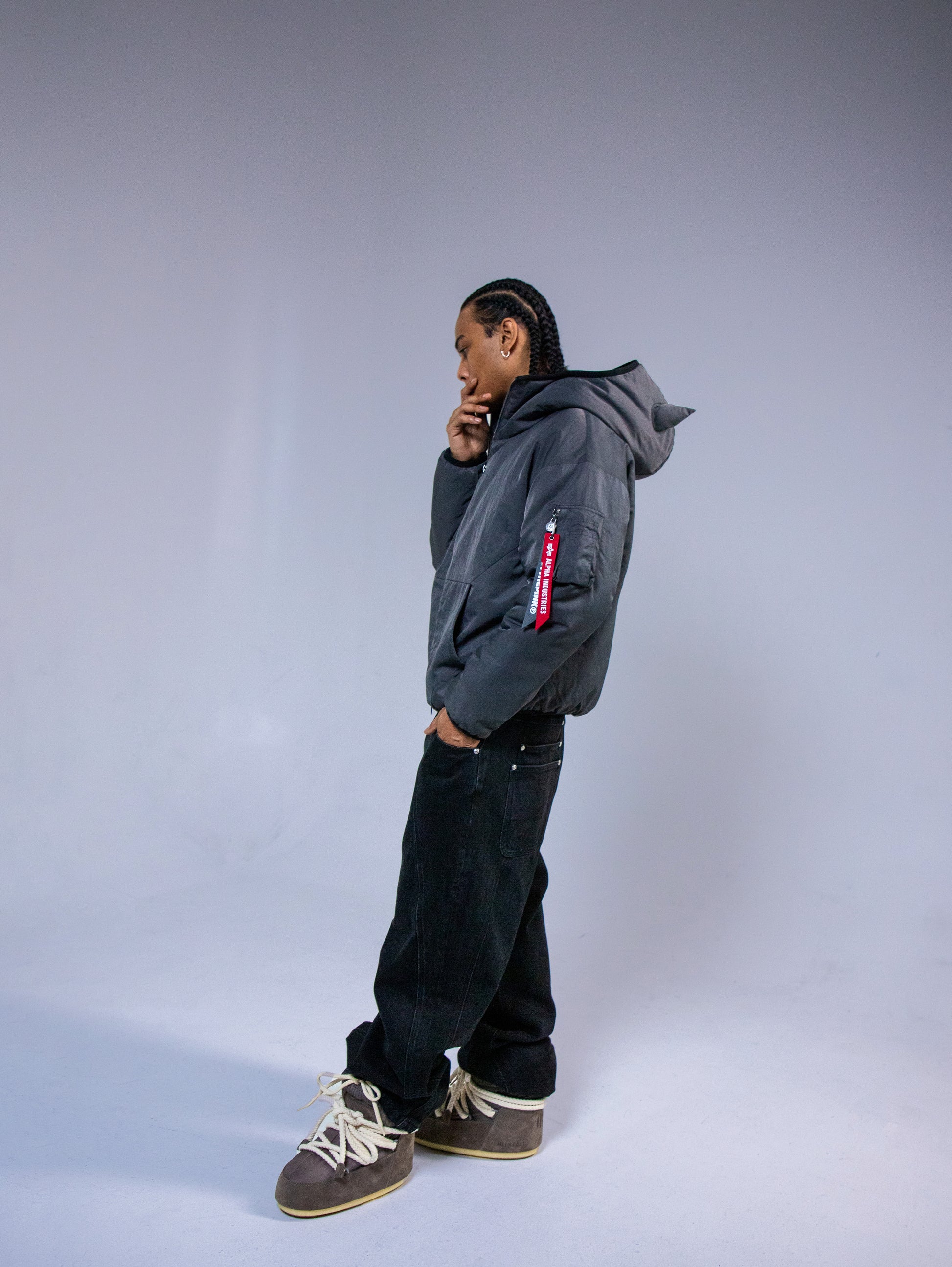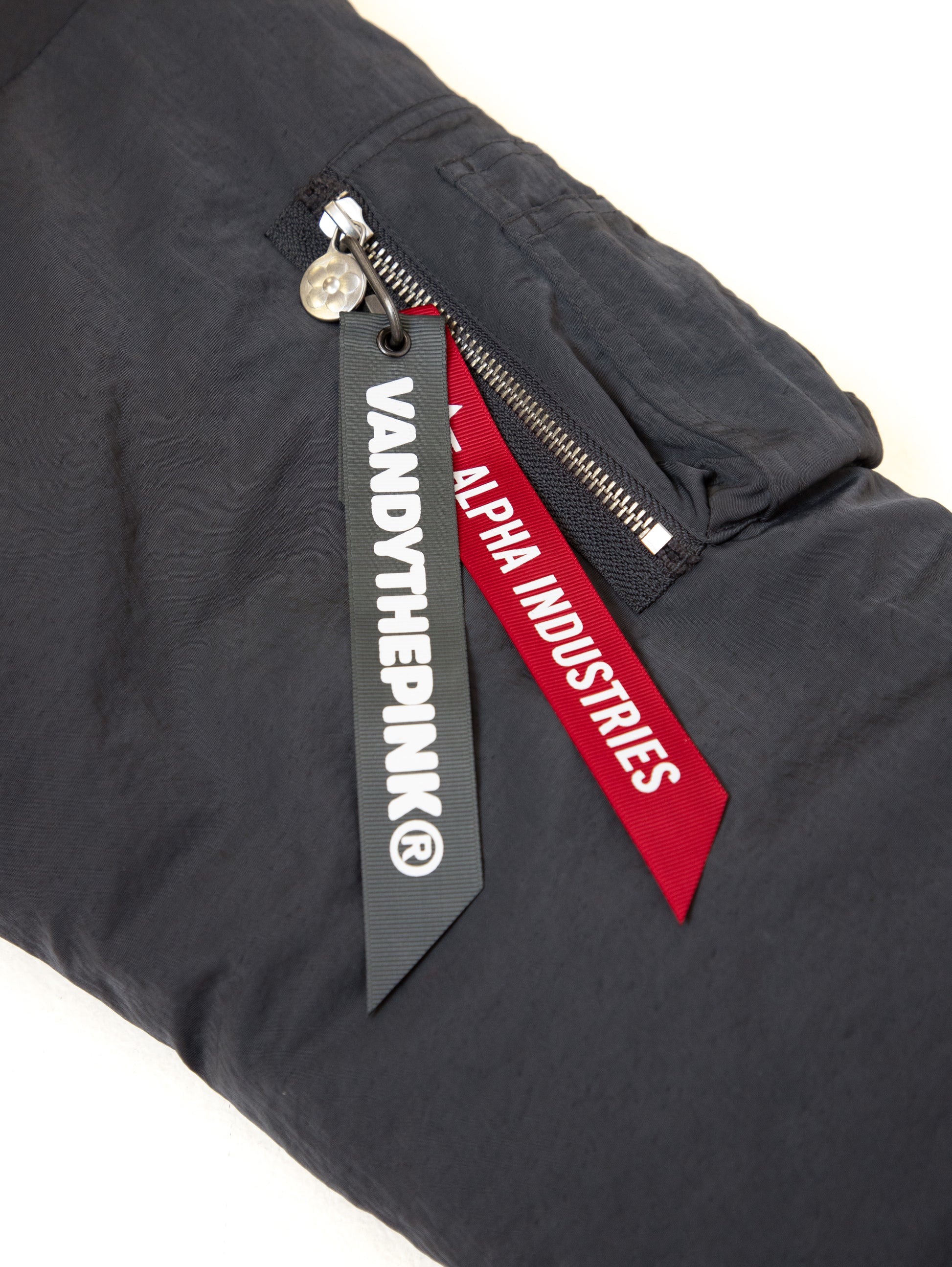 The VANDY THE PINK X ALPHA INDUSTRIES ANIMAL JACKET features embroidery on both front and back, and an attached hood with horn detail.